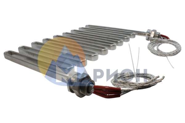 Габаритные размеры нагревателя — 440×295 мм. Материал корпуса нагревателя — нержавеющая сталь. Нагрев осуществляется с помощью трех греющих проводов сечением 3.5 мм2, располагающихся в корпусе. Мощность каждого провода 8.833 кВт. Расчетное напряжение сети — 400 В. По требованию заказчика в конструкцию добавлена трубка для установки датчика температуры и изогнутый металлический отвод длиной 25 мм под заземляющий кабель. Подключение реализовано с помощью штуцеров М36×1.5.